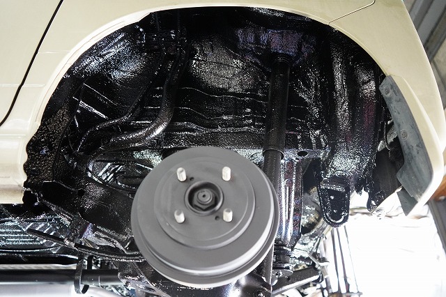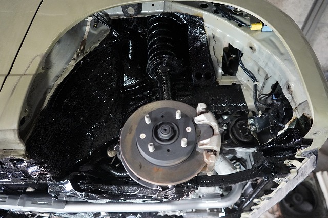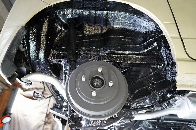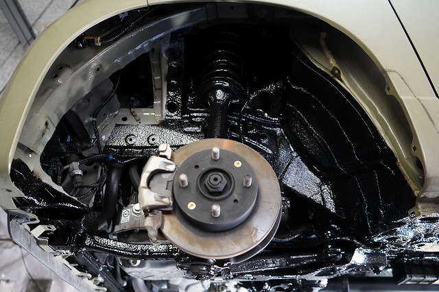 WAX系の防錆剤の上には一般的な油性のノックスドールは馴染みませんので、何も塗られていないフロア部には油性のノックスドールUM1600、WAX防錆済みの足回り構成部品はWAX系のノックスドール300を使用して施工します