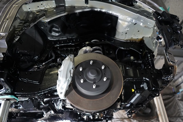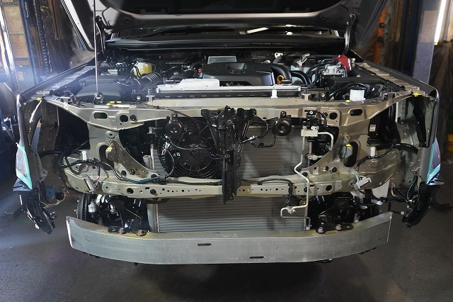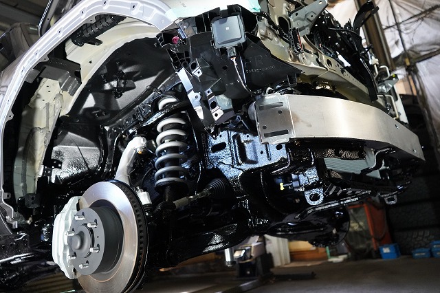 フロントバンパー、ヘッドライトユニット等を外して、普段は隠れている部分にも防錆します