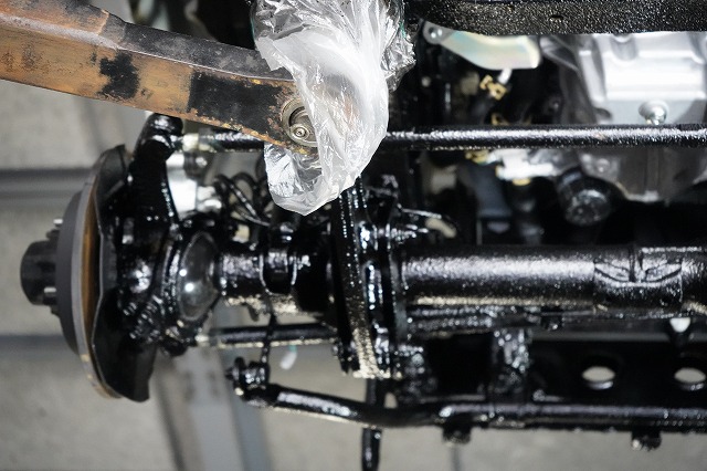 タイヤハウス内であってもサスペンションやショックアブソーバー、将来サビによる腐食で燃料漏れが起きやすい燃料ホースなどはノックスドールを塗っています