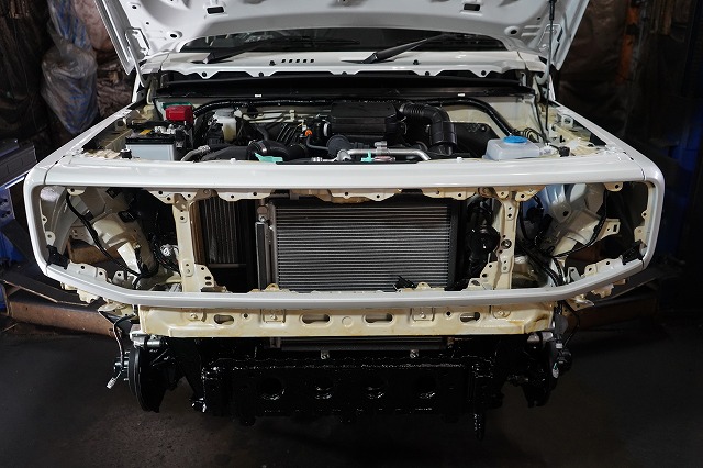 フロントバンパー、ヘッドライトユニット等を外して、普段は隠れている部分にも防錆します