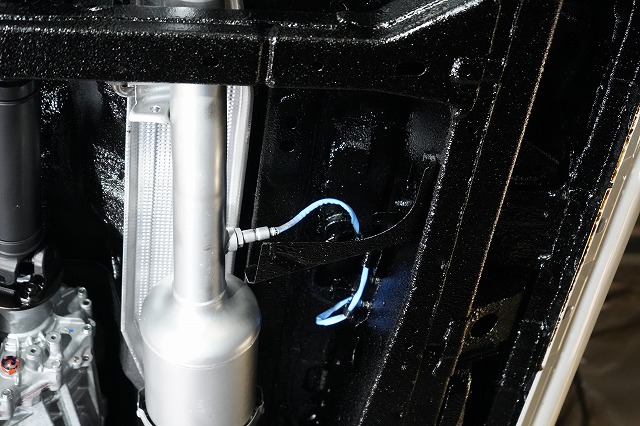 タイヤハウス内であってもサスペンションやショックアブソーバー、将来サビによる腐食で燃料漏れが起きやすい燃料ホースなどはノックスドールを塗っています