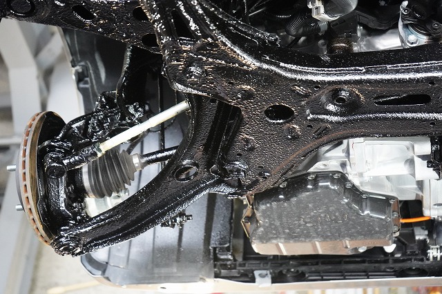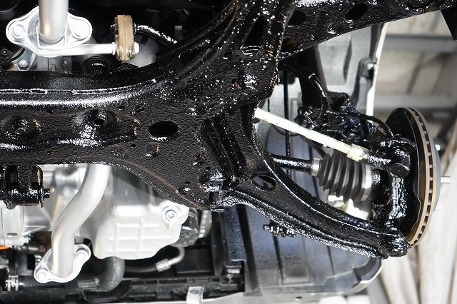 タイヤハウス内であってもサスペンションやショックアブソーバー、将来サビによる腐食で燃料漏れが起きやすい燃料ホースなどはノックスドールを塗っています