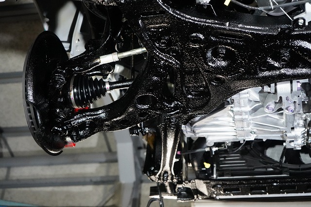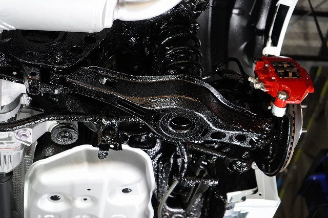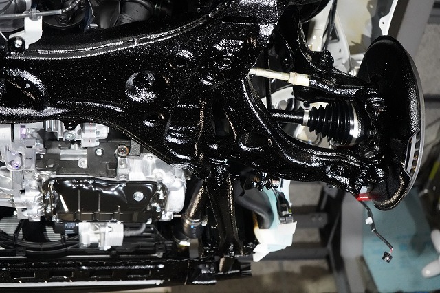 タイヤハウス内であってもサスペンションやショックアブソーバー、将来サビによる腐食で燃料漏れが起きやすい燃料ホースなどはノックスドールを塗っています