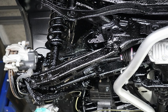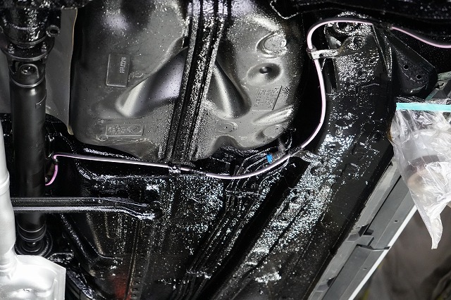タイヤハウス内であってもサスペンションやショックアブソーバー、将来サビによる腐食で燃料漏れが起きやすい燃料ホースなどはノックスドールを塗っています