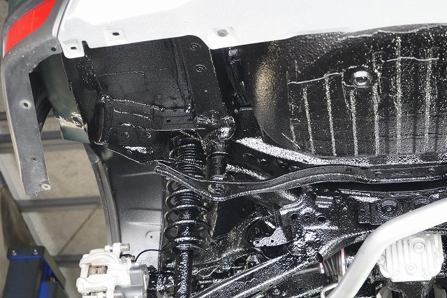 フロントタイヤハウス内にもWAX系の防錆剤が塗られていましたので、同部にはWAX系のノックスドール300を使用して施工しています