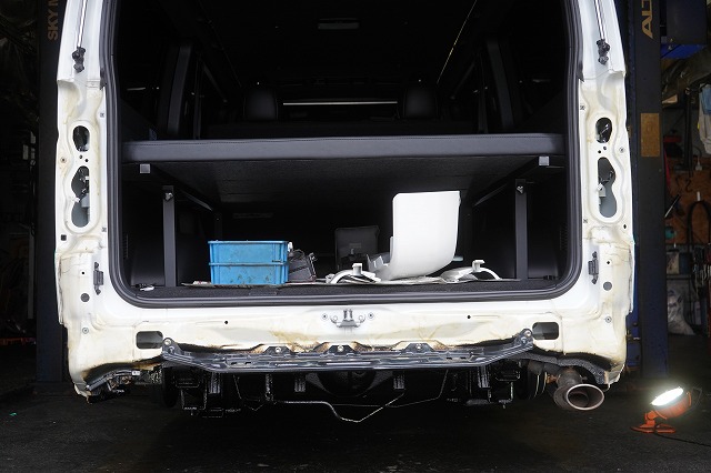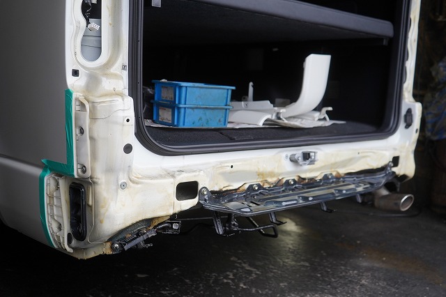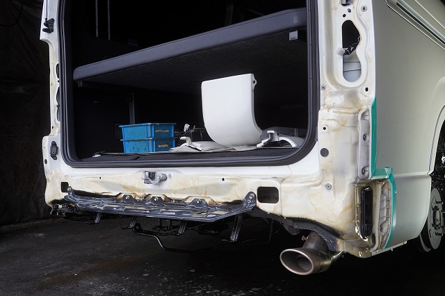 ドアパネルなど外板パネルの内部防錆を行った上で、リアバンパー、テールレンズを外して普段は隠れた部分まで防錆する、プレミアム コンプリートプラス(リア側のみ)での施工です