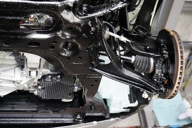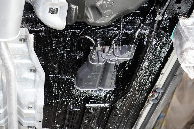 タイヤハウス内であってもサスペンションやショックアブソーバー、将来サビによる腐食で燃料漏れが起きやすい燃料ホースなどはノックスドールを塗っています