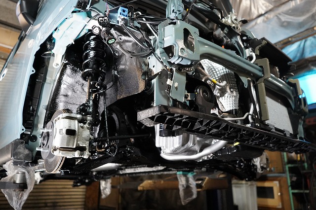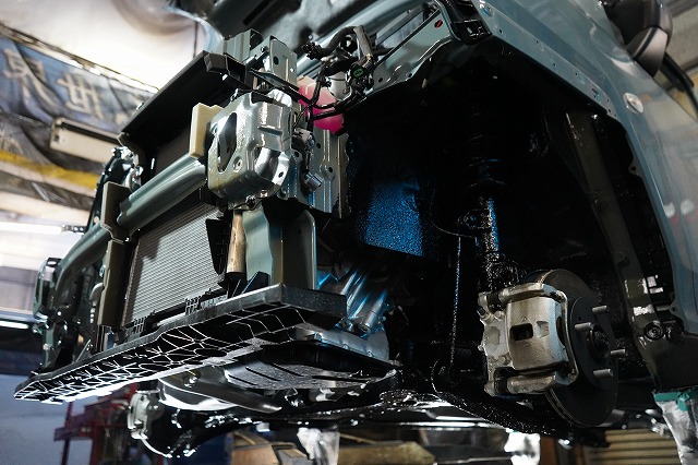 フロントバンパー、ヘッドライトユニット等を外して、普段は隠れている部分にも防錆します