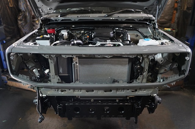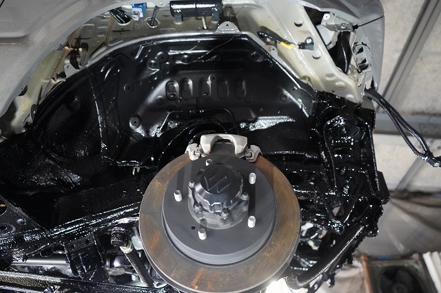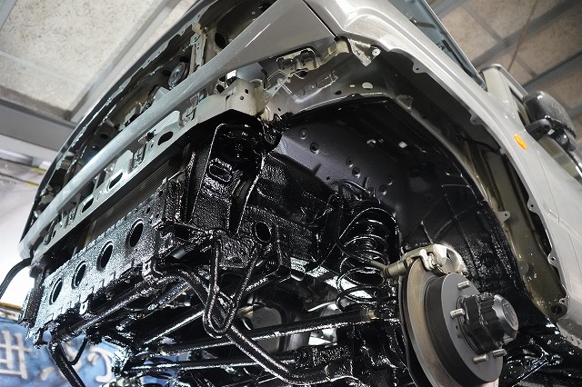 フロントバンパー、ヘッドライトユニット等を外して、普段は隠れている部分にも防錆します