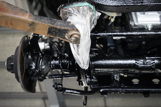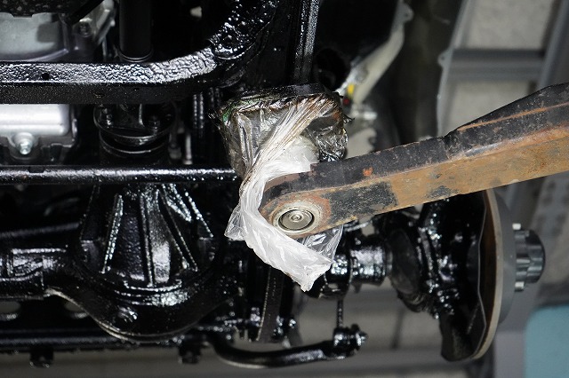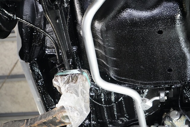 タイヤハウス内であってもサスペンションやショックアブソーバー、将来サビによる腐食で燃料漏れが起きやすい燃料ホースなどはノックスドールを塗っています