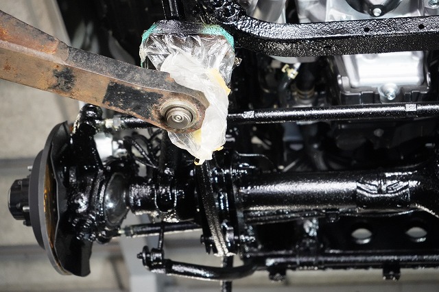 タイヤハウス内であってもサスペンションやショックアブソーバー、将来サビによる腐食で燃料漏れが起きやすい燃料ホースなどはノックスドールを塗っています