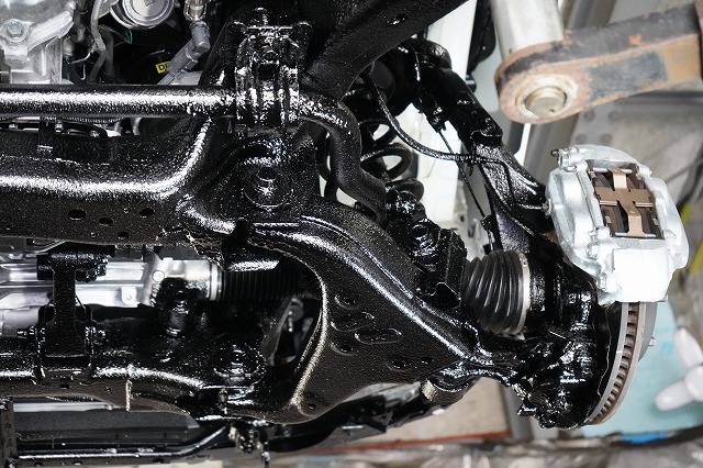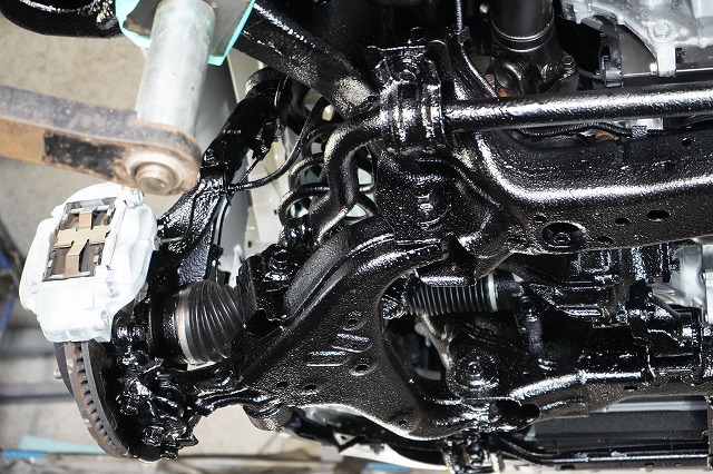 タイヤハウス内であってもサスペンションやショックアブソーバー、将来サビによる腐食で燃料漏れが起きやすい燃料ホースなどはノックスドールを塗っています