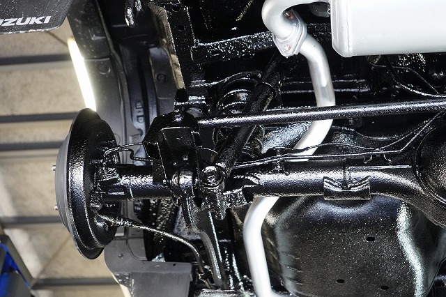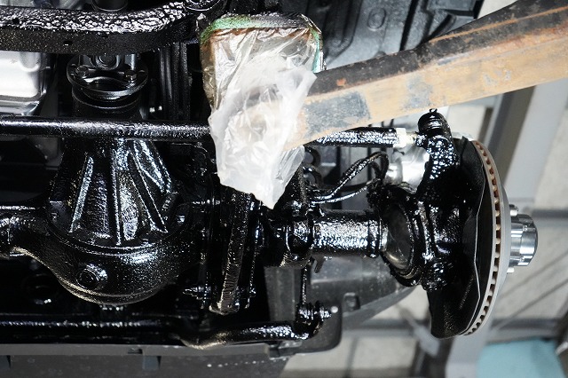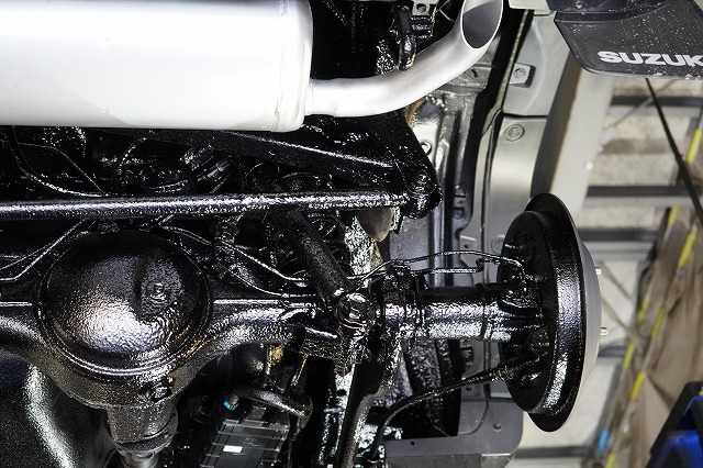 タイヤハウス内であってもサスペンションやショックアブソーバー、将来サビによる腐食で燃料漏れが起きやすい燃料ホースなどはノックスドールを塗っています